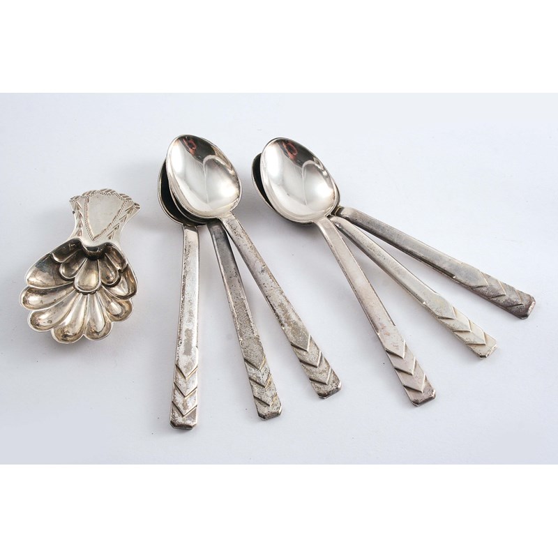 A set of six Art Deco Revival coffee spoons with chevron decorated terminals, London 1960/61 together with a caddy spoon by T. Bradbury & Sons, Sheffield 1911; the latter 2.3" (6 cms) long; 3.5 oz (7)
