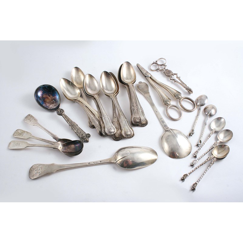 A late 17th century Trefid spoon, a pair of modern grape shears, a pair of antique sugar nips, three egg spoons, six Dutch coffee spoons, an 18th century French Fiddle table spoon, a Norwegian spoon and eleven George III King's pattern tea spoons; 24.6 oz (lot)