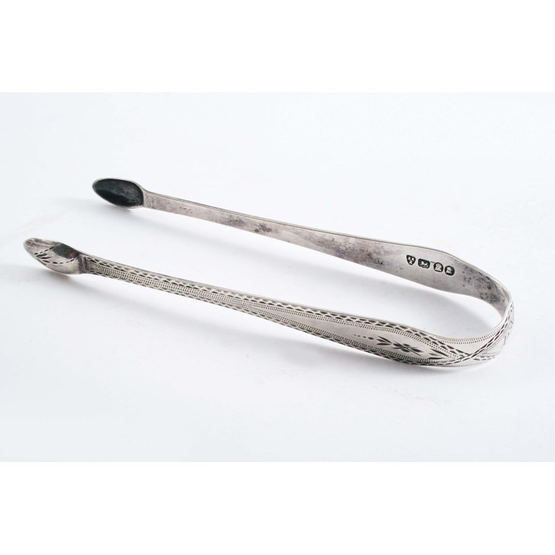A scarce pair of George III provincial sugar tongs with bright-cut decoration, initialled "M" over "P.S", by Thomas Watson, Newcastle 17967; 5.75" (14.7 cms) long; 1 oz