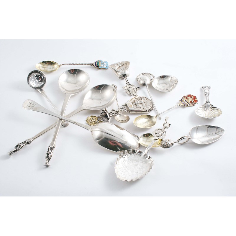 of various Continental spoons, three souvenir tea spoons, a George III condiment sifter ladle, a Rattail table spoon and a plated caddy spoon; the largest spoons 7.5" (19 cms) long; 11.2 oz weighable silver (15)
