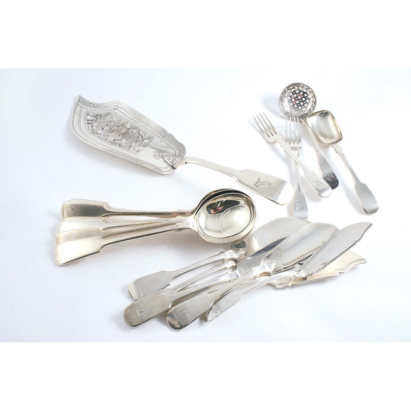 Six various antique butter knives, two small forks, a fish slice, a sugar spoon, a sugar sifter ladle & a set of six soup spoons, some pieces initialled, some crested, mixed dates & makers; 33.3 oz (17)