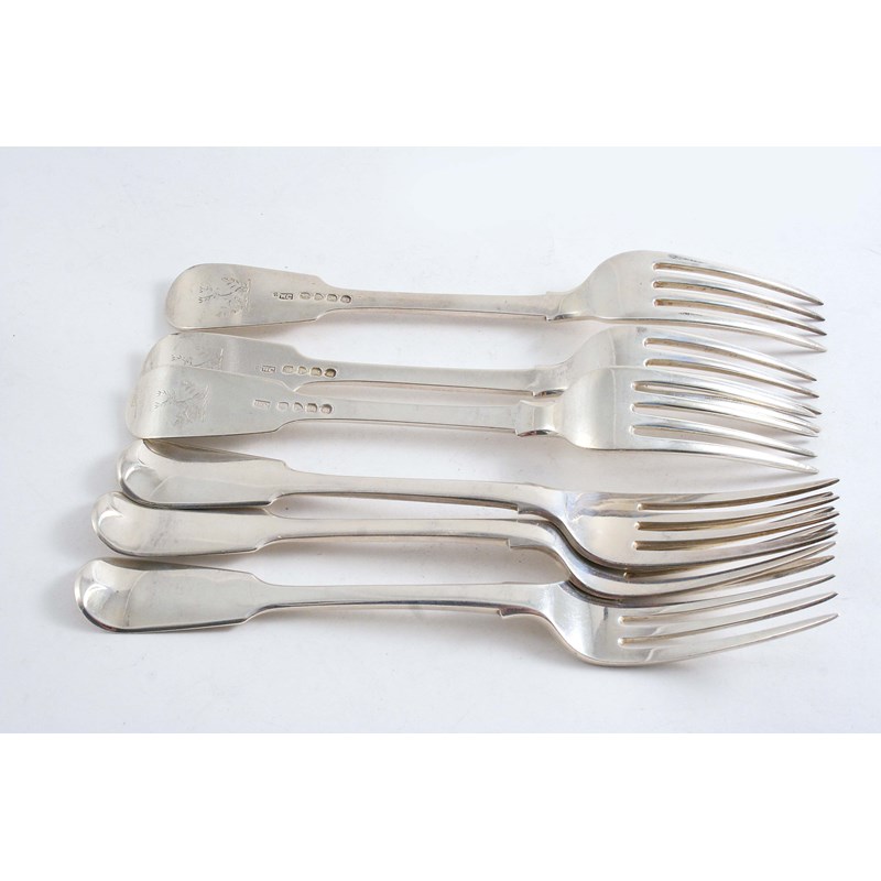 A SET OF SIX GEORGE IV FIDDLE PATTERN TABLE FORKS crested, by William Chawner, London 1825; 15.9 oz (6)