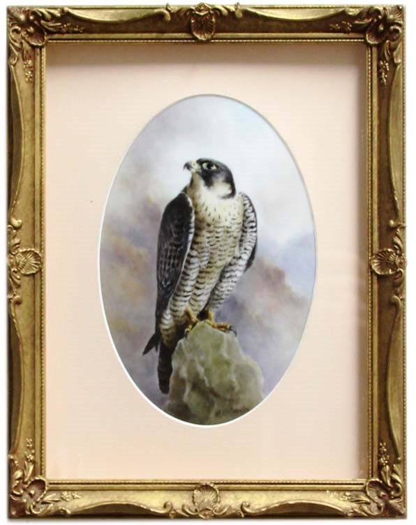MILWYN HOLLOWAY (Royal Worcester Artist) Falcon on a Rock, oval porcelain plaque, signed, printed mark verso, 22cm x 14cm