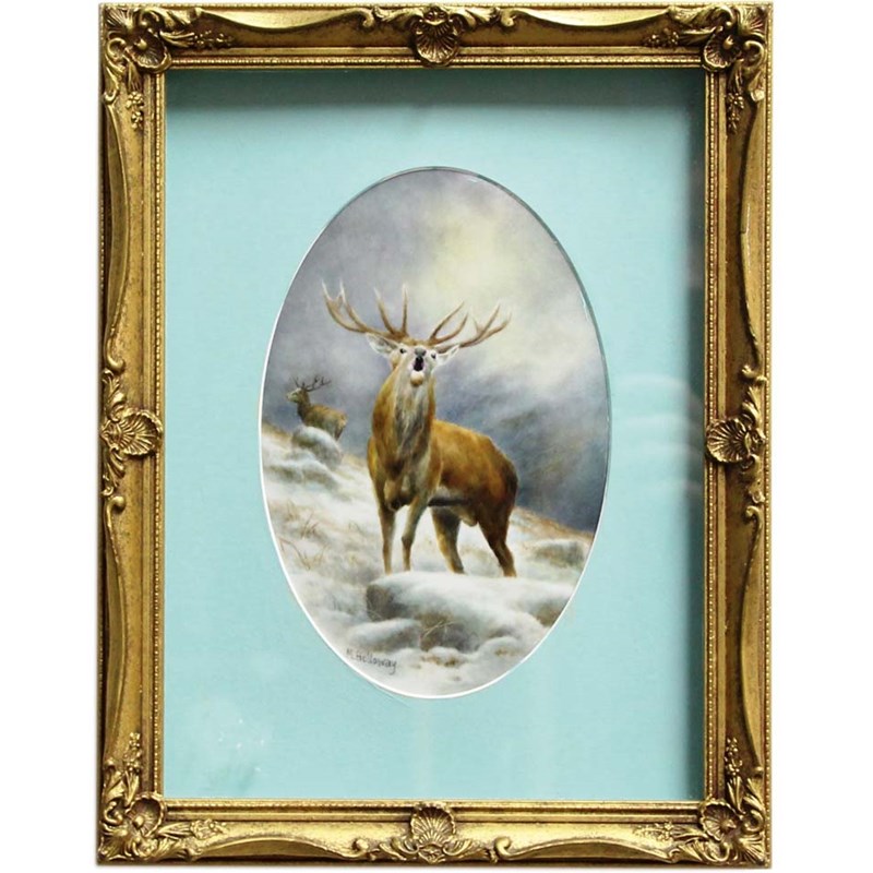MILWYN HOLLOWAY (Royal Worcester Artist), Stag in Winter, oval porcelain plaque, signed and printed mark verso, 21cm x13.5cm