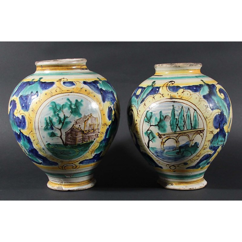 PAIR OF MAIOLICA VASES, late 18th/early 19th century, painted with an oval scene of a building on a scrolling foliate ground, height 28cm (2)