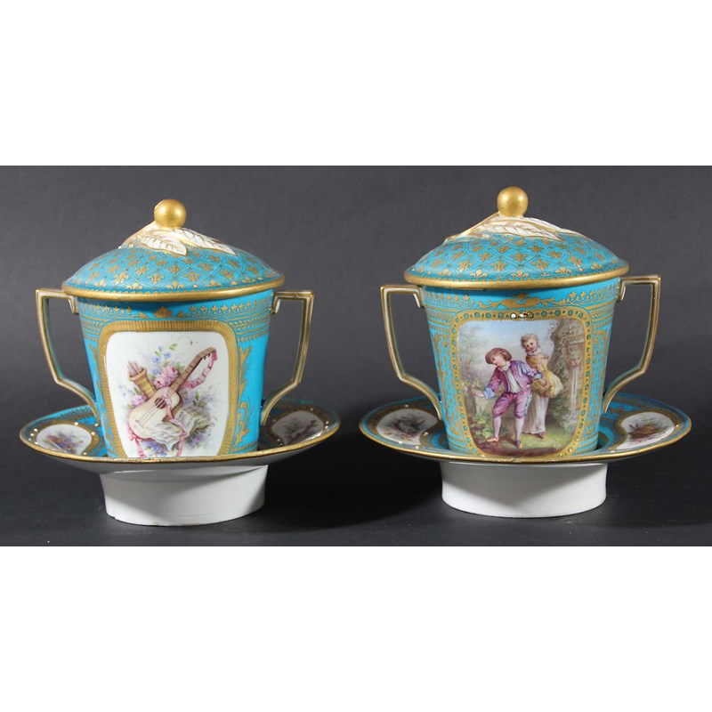 PAIR OF SEVRES TWO HANDLED CUPS, COVERS AND TREMBLEUSE SAUCERS,