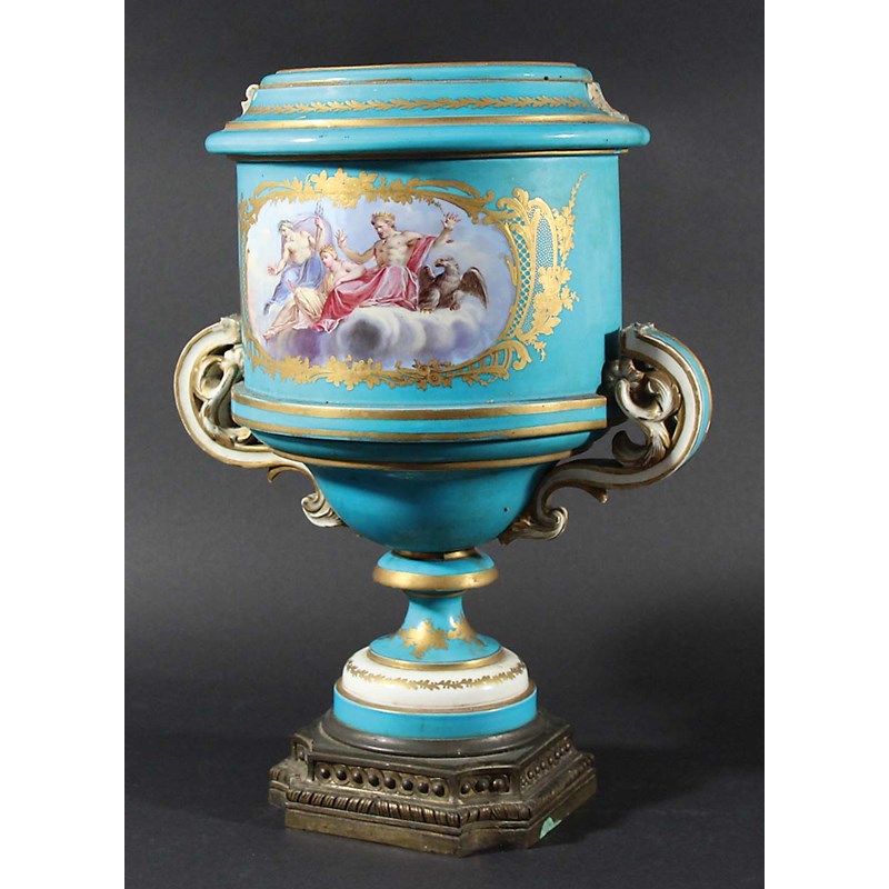 early 19th century, painted with a scene of Zeus and his eagle, Poseidon and Athena seated on clouds inside a gilt, scrolling cartouche, the reverse with a a bouquet of flowers, on a bleu celeste ground, on a gilt bronze foot, lacking handles and cover, blue interlinked Ls, height 37cm