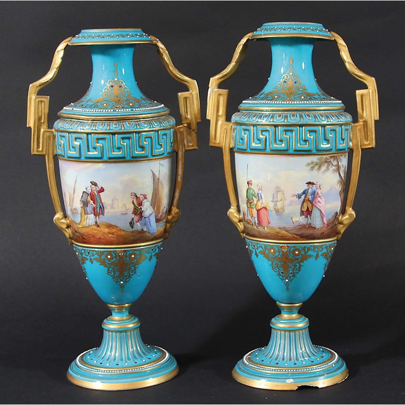 19th century, painted with continuous scenes of figures in a coastal setting beneath a moulded Greek Key band, gilt and jewelled decorartion on a bleu celeste ground, lacking covers and damages, blue inter linked Ls, height 32cm (2)