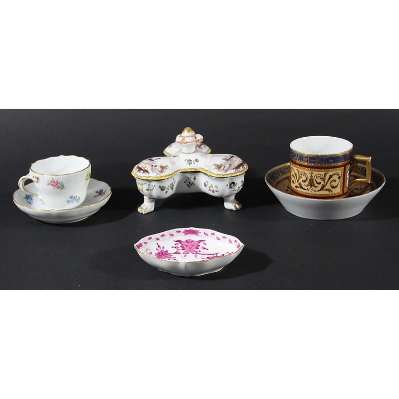 painted with scattered flowers, blue crossed sword marks, diameter of saucer 10.5cm; together with a Furstenberg Empire style coffee can and saucer and a Meissen pin tray (5)