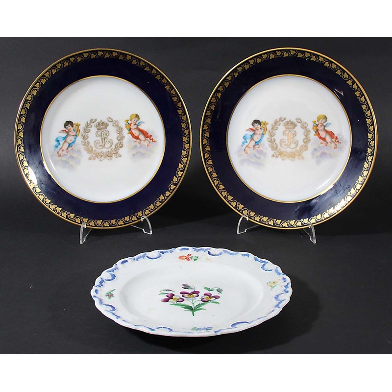 a gilt initial inside a laurel wreath flanked by a pair of cherubs, inside a blue border with gilt vine leaves, printed Chateau de Tuileries marks over a bee hive mark, diameter 24cm; together with a Meissen style plate painted with violas, blue crossed sword marks, diameter 21.5cm (3)