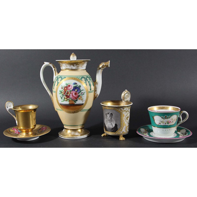 mid 19th century, painted en grisaille with a portrait of a lady on a tooled gilt and scrolling painted ground, blue sceptre mark, height 13cm; together with two continental gilt Empire style cups and saucers, a Paris Coffee Pot and cover, a part tea service and an inkwell (21)