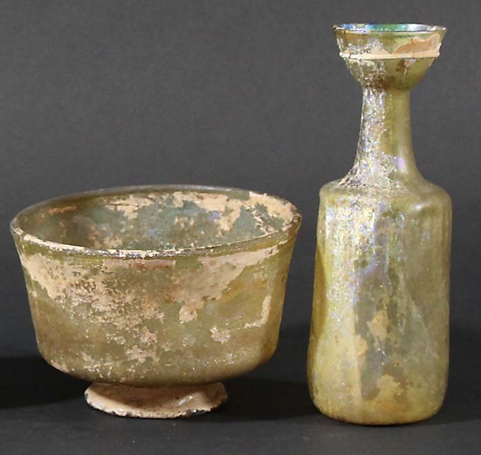 of mallet form with a rounded, flared mouth, pale olive green with iridescence, height 16cm; together with a glass footed bowl, with a slightly flared rim and small foot, pale olive green with iridescence, diameter 12cm (2)