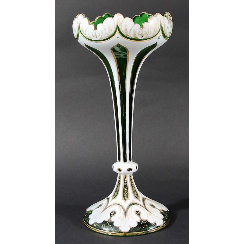 BOHMENIAN STYLE GLASS LUSTRE, white cut through to green with gilt highlights, lacking drops, height 36cm