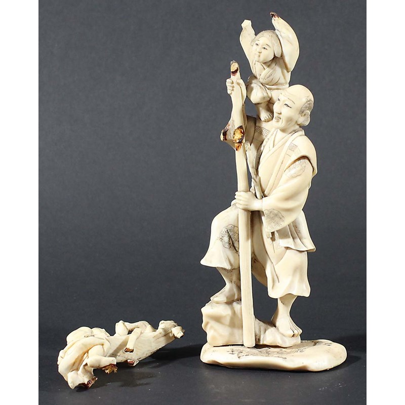 JAPANESE IVORY OKIMONO, 19th century, carved as a man balancing two boys and a monkey on his shoulder and staff, height 20cm