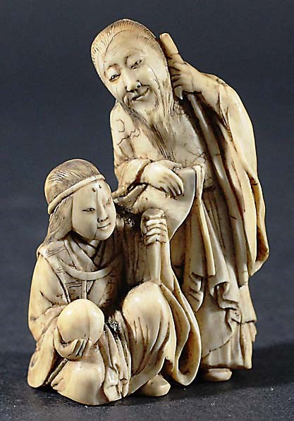 JAPANESE IVORY OKIMONO, of Shoulau and Guanyin, signature to base, height 6.5cm