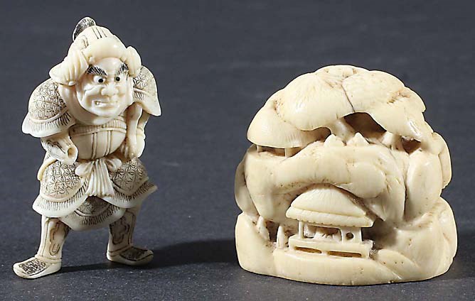 JAPANESE IVORY OKIMONO, Meiji, carved as a samurai, height 4.5cm; together with another carved as a mountain with trees, buildings and figures, height 3.5cm (2)