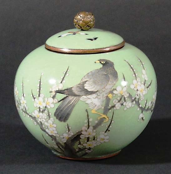 JAPANESE CLOISONNE KORO AND COVER, enamelled with a hawk in prunus branches on a celadon green ground, the cover with flower bud finial, height 8cm (2)