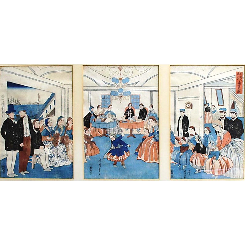 JAPANESE WOODBLOCK TRYPTICH, depicting an interior scene of western figures watching children dancing to musicians, a view of ships in a harbour beyond, each print with signature, in one frame, each print 35cm x 23cm