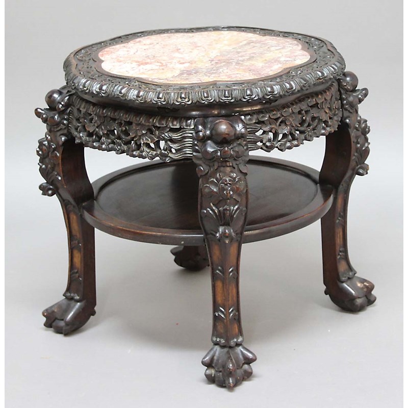 CHINESE HARDWOOD AND PINK MARBLE INSET STAND,