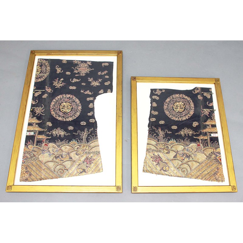 probably 19th century, worked in silk and gilt threads with a central pagoda surrounded by three mons, bats, clouds and foliage and above scrolling waves with dragons and fish, on a deep blue/black ground, incomplete and mounted in two frames, height 72cm