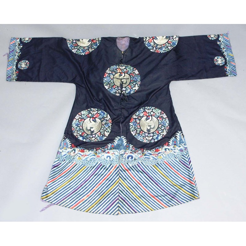 worked in coloured silks with roundels of a central crane surrounded by lotus, prunus, other flowers, butterflies and other insects above dragons playing in rolling waves above a lishui border, on a midnight blue ground, length 135cm approximately
