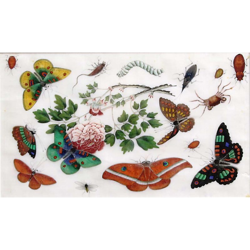 GROUP OF THREE CHINESE PITH OR RICE PAPER PAINTINGS, late 19th century, depicting flowers, insects, frog and crab, 32cm x 19cm and smaller (3)