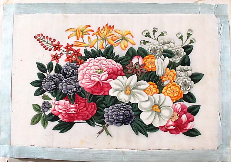 ALBUM OF TWELVE CHINESE PITH OR RICE PAPER PAINTINGS, of various floral sprays, in a silk bound album , 19cm x30cm