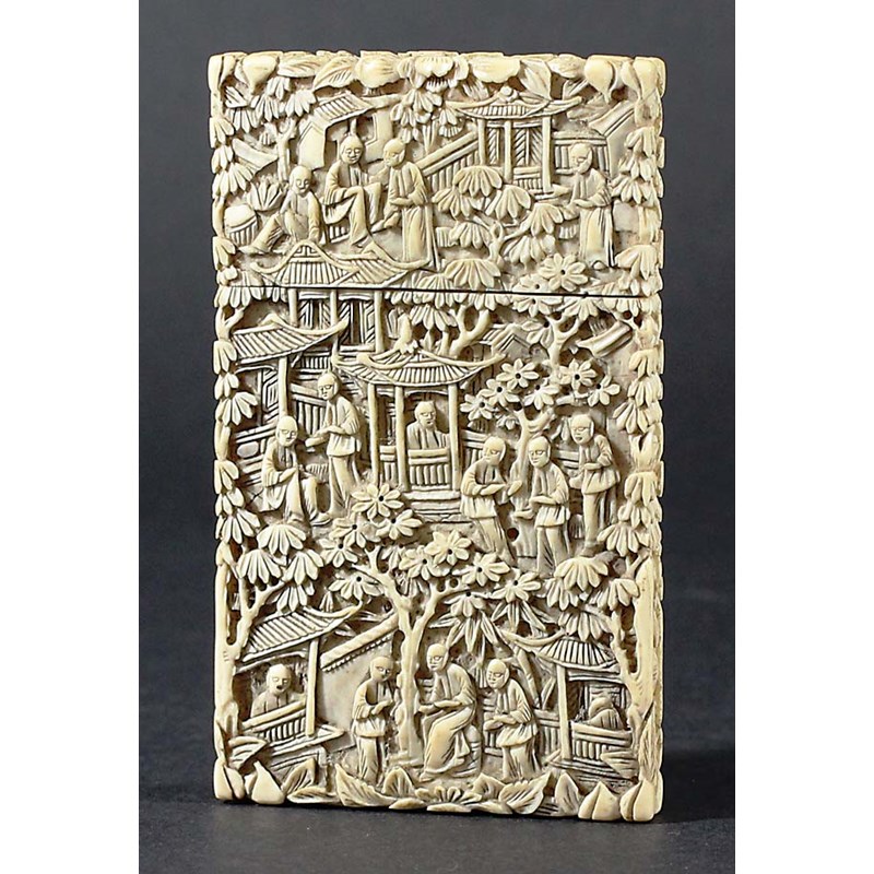 CHINESE CARVED IVORY CARD CASE, mid 19th century, with figures walking amongst pagoda and trees, height 9.5cm x 5.5cm