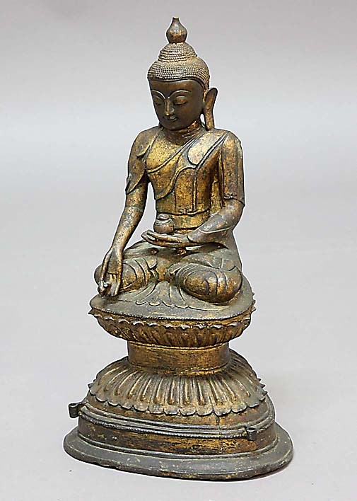 seated in meditation on a double lotus and stepped base with two candle holders, height 46cm