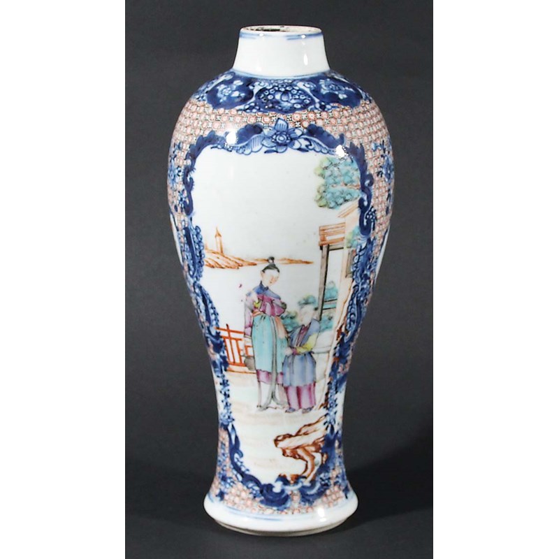 CHINESE INVERTED BALUSTER VASE, 19th century, painted with figural genre scenes on a trellis ground, lacking cover, height 26cm