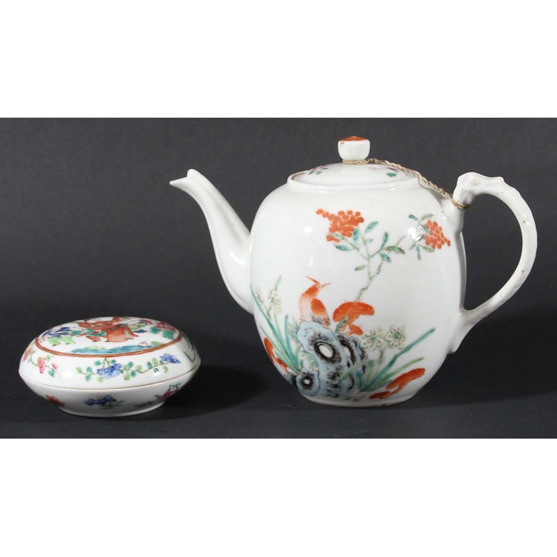 probably late 18th century, enamelled with a bird amongst rocks, fungi and flowers, length 21cm; together with a famille rose circular box and cover enamelled with boys playing, diameter 9.5cm (4)