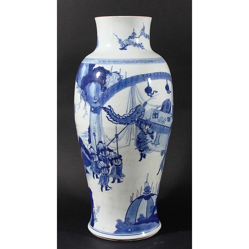 probably Kangxi, of baluster form, painted with procession before a scholar's table, possibly a reduced baluster vase, blue painted censer mark in a double ring, height 41cm