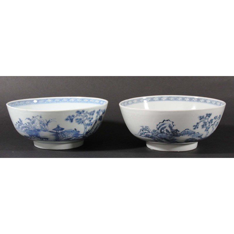 PAIR OF NANKING CARGO BOWLS, underglaze blue painted with landscape scenes with figures and pagoda, trellis interior border, diameter 19cm (2) Provenance: Christie sale Lot 2719