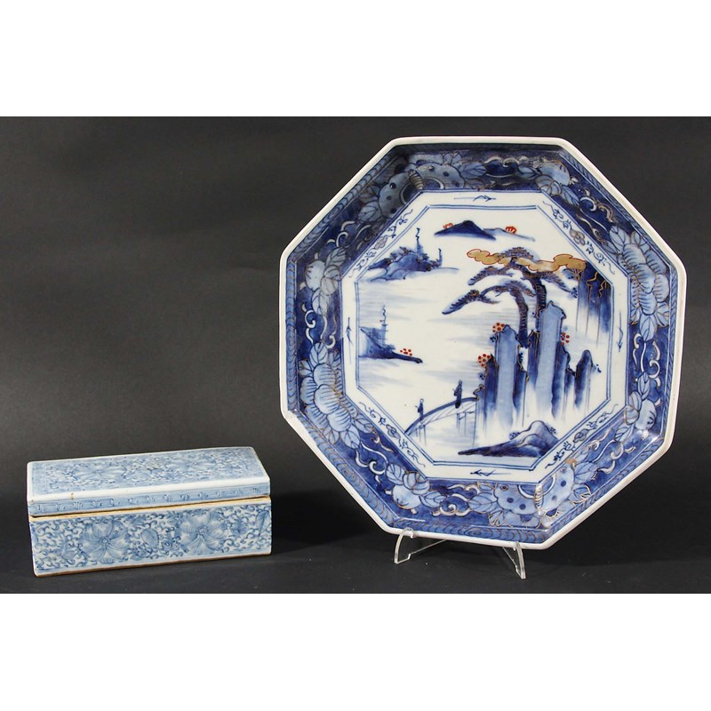painted in the imari palette with figures on a bridge beside rocks and pine trees, diameter 31.5cm; together with a Chinese blue and white box and cover and a blanc de chine dehua style figure, height 44cm (4)