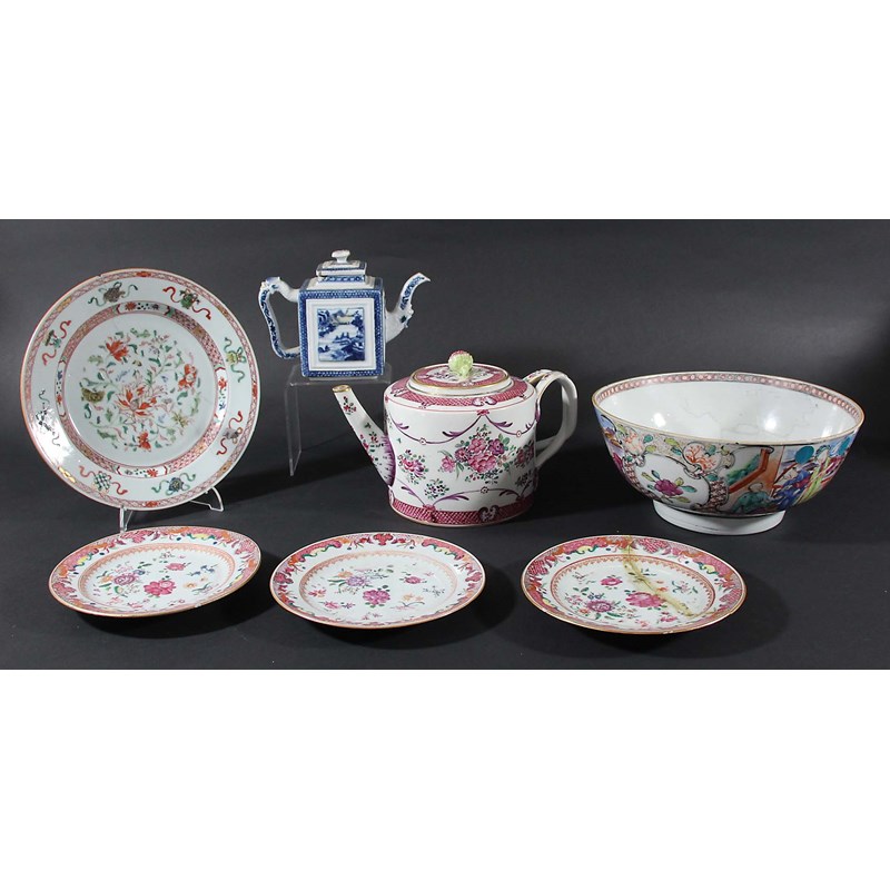 late 18th/early 19th century, painted with floral swags, length 23cm; together with another teapot and cover, a fruit bowl and plates including a copy of an armorial plate from the Sir Joseph Yates service (10)