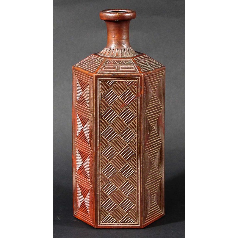 CHINESE RED STONEWARE VASE, of hexagonal form, each panel with different geometric form, impressed single character mark, height 24cm