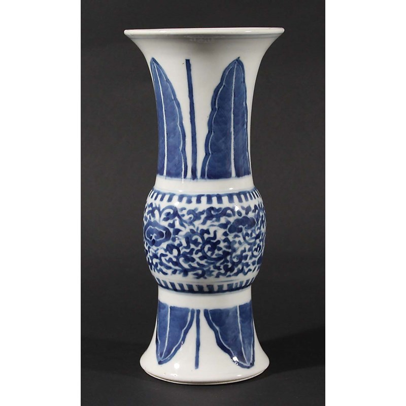 CHINESE BLUE AND WHITE GU VASE, 20th century, painted with stiff banana leaves and scrolling foliage, blue double circle mark, height 25.5cm