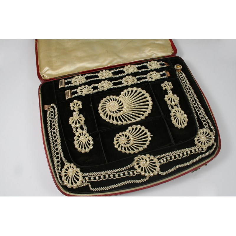 of intricate foliate design, comprising a necklace, 41cm. long, two bracelets, 17cm. and 16cm. long, a pair of drop earrings, 8cm. long, and two brooches, 8cm. and 5cm. wide. With fitted box.