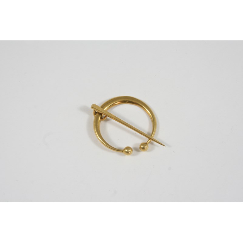 AN 18CT. GOLD CIRCULAR OPEN ENDED BROOCH with ball terminals, hallmarked for Birmingham 1938, engraved to the back W.D. & J.S.R. 1889-1939, 2.8cm. dia., 5.4 grams.