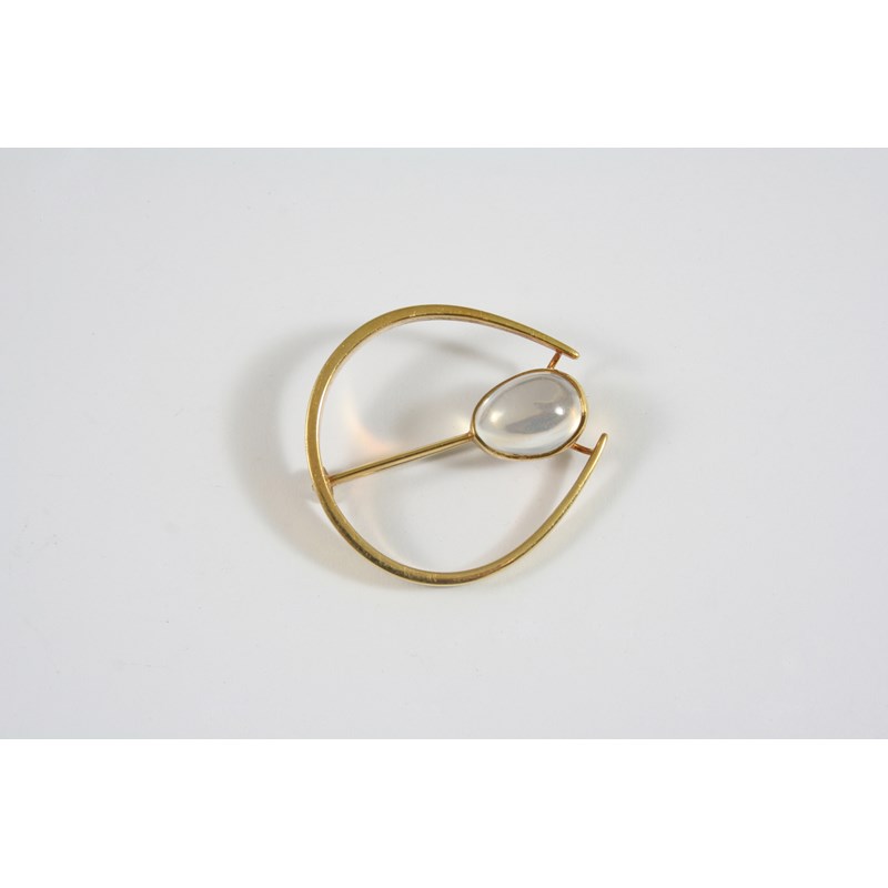 A MOONSTONE AND 18CT. GOLD BROOCH the gold openwork design is mounted with an oval cabochon moonstone, 4cm. wide.