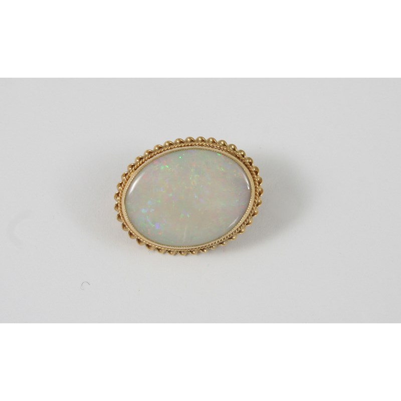 AN OPAL AND GOLD BROOCH the oval-shaped solid white opal is set in a 9ct. gold mount, 2.5cm. wide.