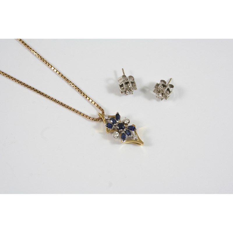 the 18ct. gold openwork mount is centred with a circular-cut sapphire, with six marquise-shaped sapphires and four circular diamonds, on a 9ct. gold chain, together with a pair of diamond cluster stud earrings.