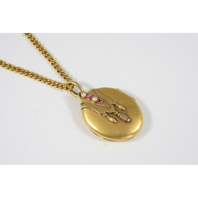 of oval shape, mounted to the front case with two small rubies and two pearls, 4 x 3cm.. on a gold neckchain, total weight 24.9 grams.