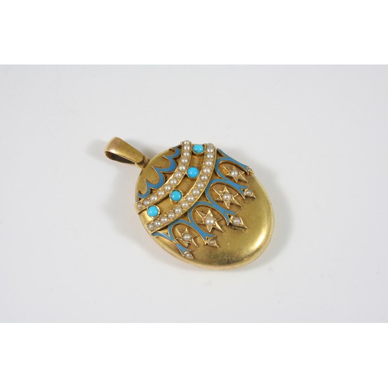 A VICTORIAN GOLD, TURQUOISE AND PEARL SET LOCKET PENDANT the oval-shaped locket is set to the front with applied turquoise and pearl set star and scrolling decoration, 4.5 x 3.5cm., 27.2 grams.