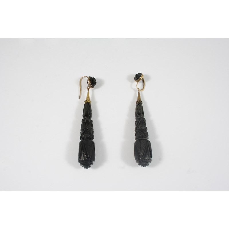 A PAIR OF VICTORIAN CARVED JET DROP EARRINGS 8cm. long.