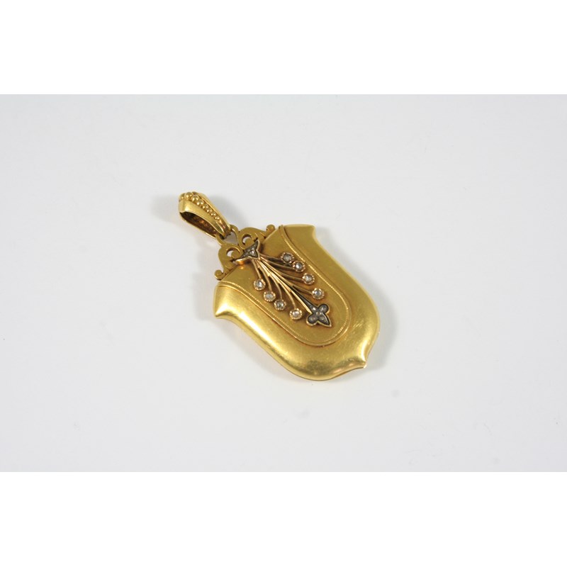 A VICTORIAN GOLD AND DIAMOND LOCKET PENDANT mounted to the front case with foliate rose-cut diamond decoration, 3cm. wide, 14.5 grams.