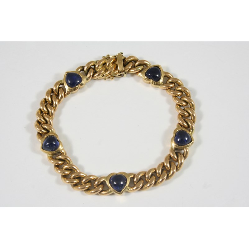AN 18CT. GOLD AND SAPPHIRE BRACELET the curb link bracelet is mounted with five heart-shaped sapphires, with concealed clasp, 18cm. long, 47.2 grams.