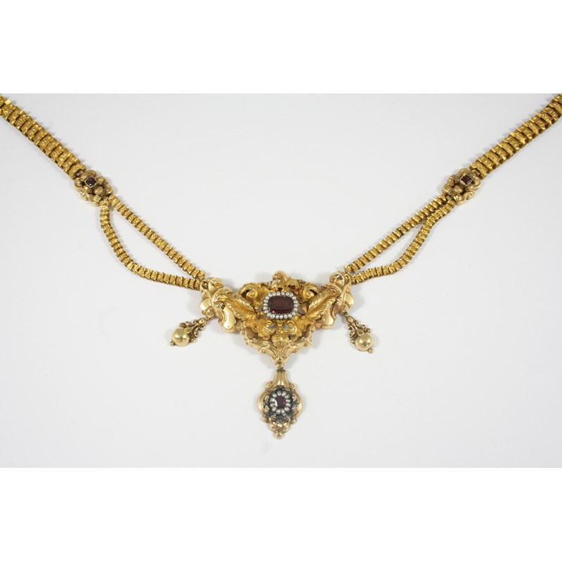 A 19TH CENTURY CONTINENTAL GOLD, GARNET AND SEED PEARL NECKLACE