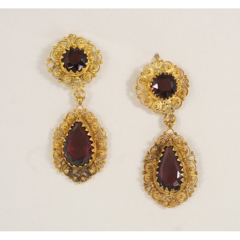 each earring set with a pear-shaped garnet drop within a surround of gold cannetille decoration, suspended from a circular-cut garnet similarly mounted, 4cm. long.