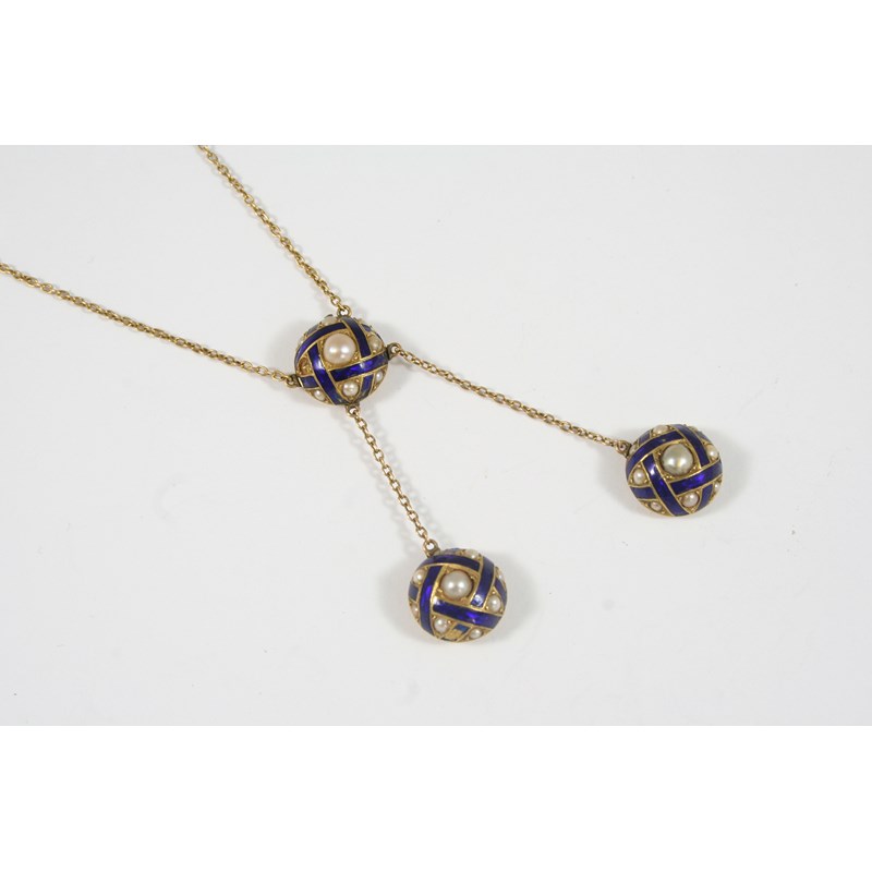 the fine link chain is mounted with three circular gold discs, each set with graduated half pearls and blue enamel decoration.